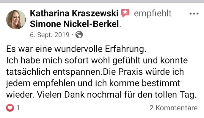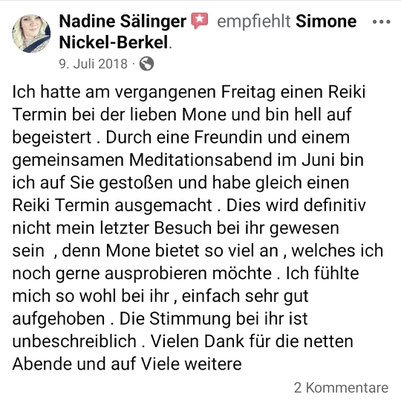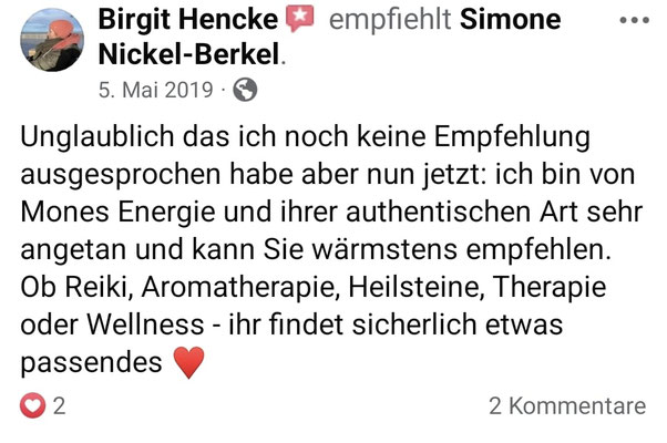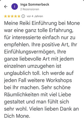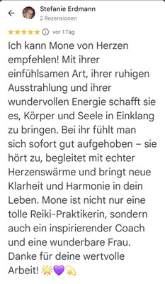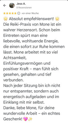 Ich hatte eine Reiki Massage und es war einfach toll 😊 Mone hat sehr viel gelöst, meine Rückenschmerzen, die ich 14 Tage lang hatte , sind wie weggezaubert 😍Genauso meine Wassereinlagerung in den Beinen sind verschwunden 😁
