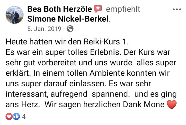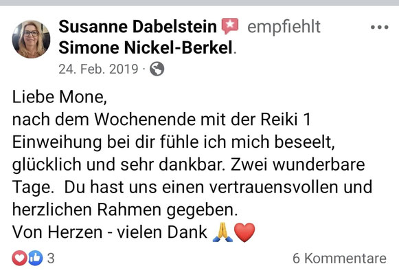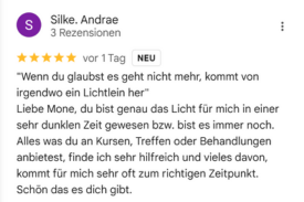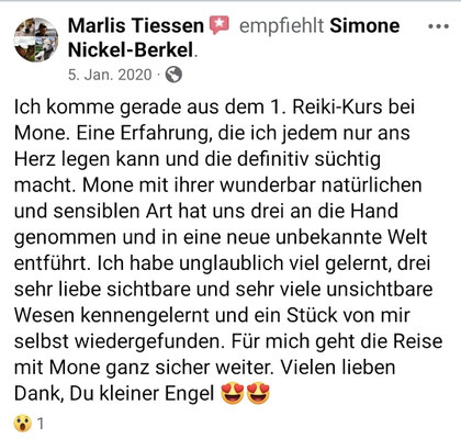 Ich komme gerade aus dem 1. Reiki-Kurs bei Mone. Eine Erfahrung, die ich jedem nur ans Herz legen kann und die definitiv süchtig macht. Mone mit ihrer wunderbar natürlichen und sensiblen Art hat uns drei an die Hand genommen und in eine neue unbekannte Welt entführt. Ich habe unglaublich viel gelernt, drei sehr liebe sichtbare und sehr viele unsichtbare Wesen kennengelernt und ein Stück von mir selbst wiedergefunden. Für mich geht die Reise mit Mone ganz sicher weiter. Vielen lieben Dank, Du kleiner Engel
