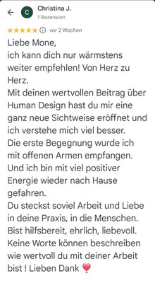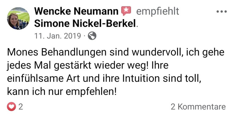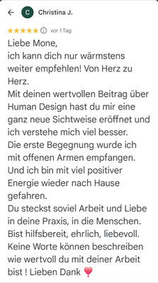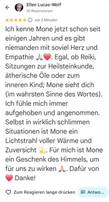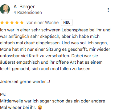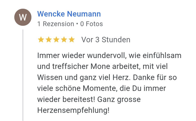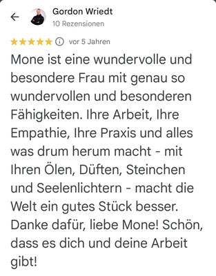 Mones Behandlungen sind wundervoll, ich gehe jedes Mal gestärkt wieder weg! Ihre einfühlsame Art und ihre Intuition sind toll, kann ich nur empfehlen!