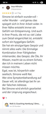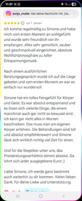Simone ist eine sehr fürsorgliche und einfühlsame Frau. Ihre Arbeit ist in jeder Hinsicht, eine wahre Bereicherung. Jeder kann denke ich bei ihr so sein , wie er gerade ist! Wundervoll! Mit ihrem großen Reichtum an Wissen , umsorgt sie einen mit all ihrem Können! Ich kann sie nur jedem empfehlen! Mach weiter so Liebes, du bist toll.