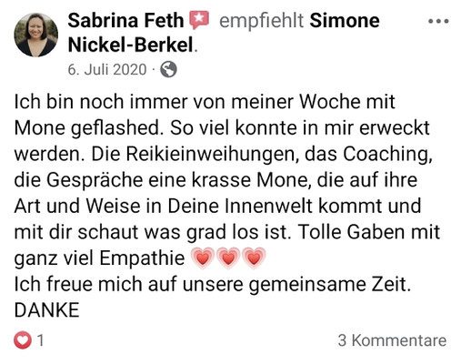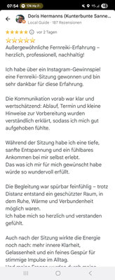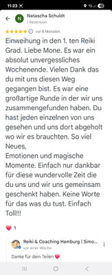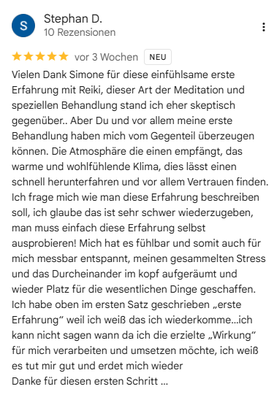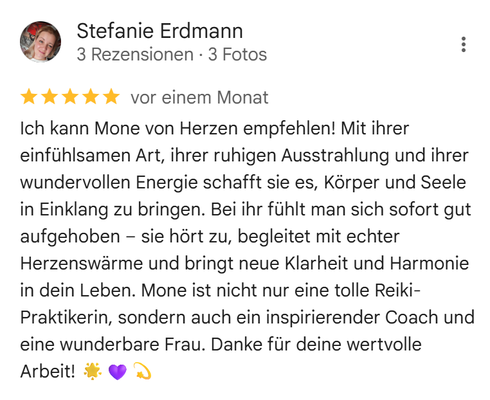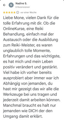 Doch dann kam endlich mein lang ersehnter Termin bei Mone. Ich war ziemlich aufgeregt und gespannt darauf, was mich erwarten würde. Als ich ankam, habe ich mich direkt wohl gefühlt und mich gut aufgehoben gewusst. Nach der Behandlung waren alle Zweifel weg. Ich habe gespürt, wie Reiki funktioniert. Wie die Energie durch meinen Körper läuft und gearbeitet hat. Direkt nach der Behandlung ging es mir schon sehr viel besser. Kurz darauf habe ich mich dann bei Mone in den 1. Grad einweisen lassen. Seitdem kann ich mir nicht nur bei Kopf- oder Magenschmerzen helfen, ich kann auch anderen helfen. Und wisst ihr was das schönste ist? Ich nehme seit fünf Wochen KEINE Medikamente mehr und ich habe KEINE Schmerzen mehr! Ich habe so viel Lebensqualität zurück erhalten. Ich bin unglaublich dankbar und kann es jedem nur ans Herz legen - auch wenn es unwirklich scheint, es hilft! 💝 Danke Mone für deine wundervolle Hilfe!