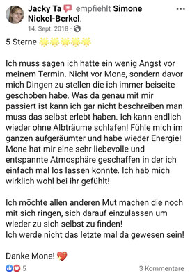 Ich muss sagen ich hatte ein wenig Angst vor meinem Termin. Nicht vor Mone, sondern davor mich Dingen zu stellen die ich immer beiseite geschoben habe. Was da genau mit mir passiert ist kann ich gar nicht beschreiben man muss das selbst erlebt haben. Ich kann endlich wieder ohne Albträume schlafen! Fühle mich im ganzen aufgeräumter und habe wieder Energie! Mone hat mir eine sehr liebevolle und entspannte Atmosphäre geschaffen in der ich einfach mal los lassen konnte. Ich hab mich wirklich wohl bei ihr gefühlt!