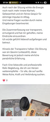 Reiki, Reiki-Massage, Gespräche, die Steine, die Öle...alles was sie macht und wie sie mit einem arbeitet ist wertschätzend und respektvoll. Man spürt förmlich die Hingabe zu Ihrer Berufung. Bei mir hat sich in den letzten Wochen viel getan. Ich bin sehr glücklich und so dankbar Sie und ihre Arbeit zu kennen.