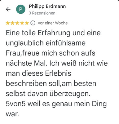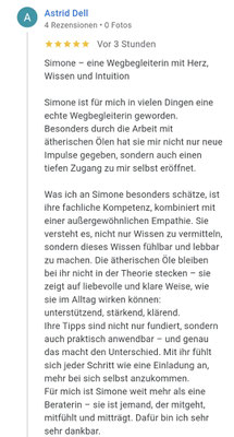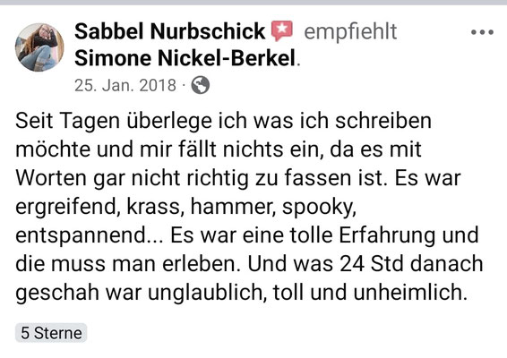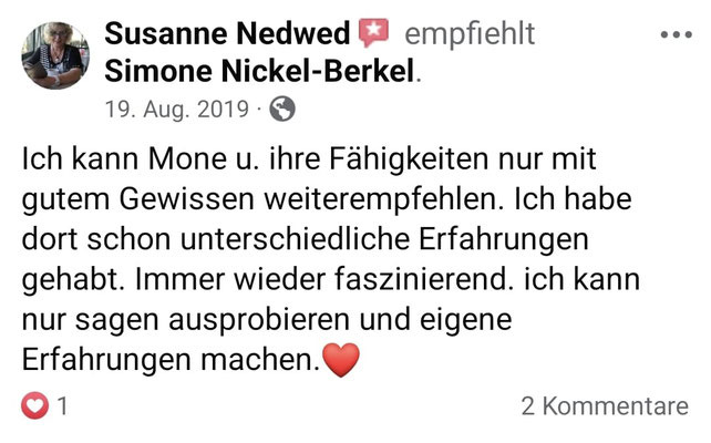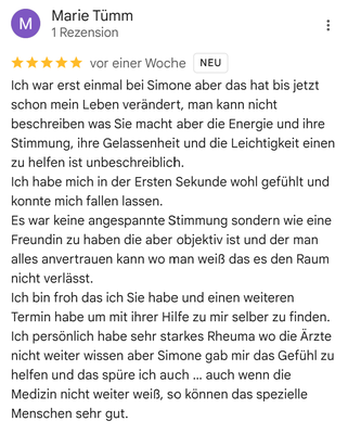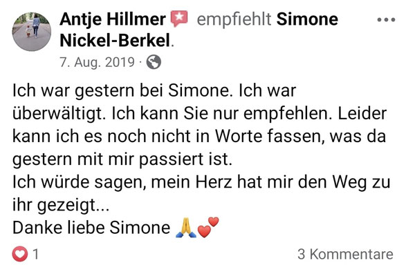 Ich war gestern bei Simone. Ich war überwältigt. Ich kann Sie nur empfehlen. Leider kann ich es noch nicht in Worte fassen, was da gestern mit mir passiert ist.