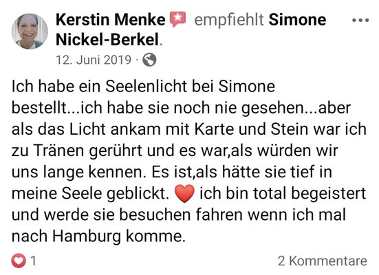 Liebe Simone, ich glaube ganz fest an Schicksal und danke dir von Herzen für meine erste Reiki Erfahrung. Mit sehr viel Empathie und Energie hast du die Kanäle geöffnet und gereinigt - es hat viele Blockaden sofort gelöst. Du hast eine ganz wunderbare Aufgabe den Menschen zu helfen - ich freue mich auf ein Wiedersehen und danke dir von Herzen für den wunderbaren Heilstein- ganz liebe Grüße Orchidee