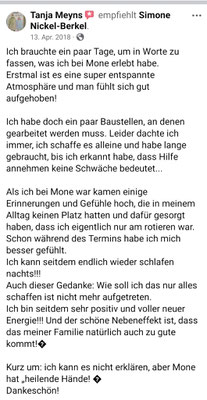 Danke Mone!!! Es ist wunderschön bei dir. Und ich merke wie sich deine Behandlungen immer noch die nächsten Tage und Wochen auswirken.