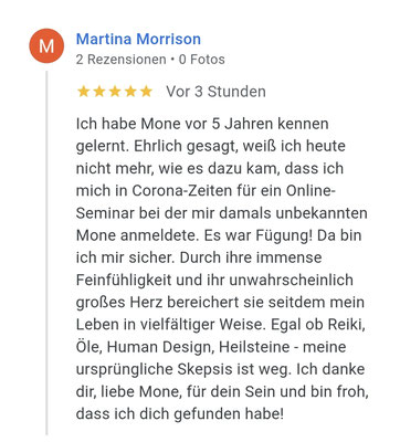 Da ich schon viele unglaubliche, unerklärliche und magische Begegnungen mit Mone hatte, habe ich mich gerne auf die 30 Tage Fern-Reiki Behandlung eingelassen. Ich teilte ihr mein Thema (Annahme) mit, woraufhin Mone die Behandlung/Energie bereitstellte, die ich in den folgenden 30 Tagen abrufen konnte ganz so wie es bei mir passte. Tatsächlich fiel es mir nicht so leicht, mich darauf einzulassen, und wurde recht unruhig beim so Daliegen, so dass ich es anfangs auch mit anderen Meditationen von Mone kombiniert habe, was dann gut geklappt hat. Spannenderweise hat sich zum Ende der Zeit eine große Sache im Außen verändert, die ich immer nicht annehmen konnte, als ob sie auch gar nicht angenommen werden wollte und sich damit aufgelöst hat. Zudem hatte ich einmal das Gefühl eine Meeresschildkröte zu sein und kurz danach zeigten sich ohne danach zu suchen gleich zwei so passende Bedeutungen dafür. Also jede Begegnung mit Mone ist nur zu empfehlen, ganz egal, ob vor Ort, virtuell oder über die Ferne. Sie berührt dich und bringt dich auf deinem Weg ein Stückchen weiter. Und das von Herzen. ❤ Danke dafür! 🙏🏻