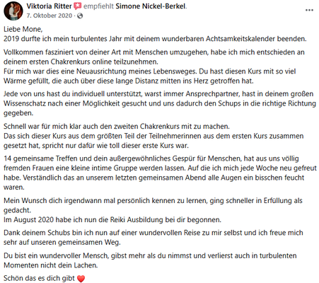 Mone ist eine wundervolle und besondere Frau mit genau so wundervollen und besonderen Fähigkeiten. Ihre Arbeit, Ihre Empathie, Ihre Praxis und alles was drum herum macht - mit Ihren Ölen, Düften, Steinchen und Seelenlichtern - macht die Welt ein gutes Stück besser. Danke dafür liebe Mone Nickel! Schön, dass es dich und deine Arbeit gibt!